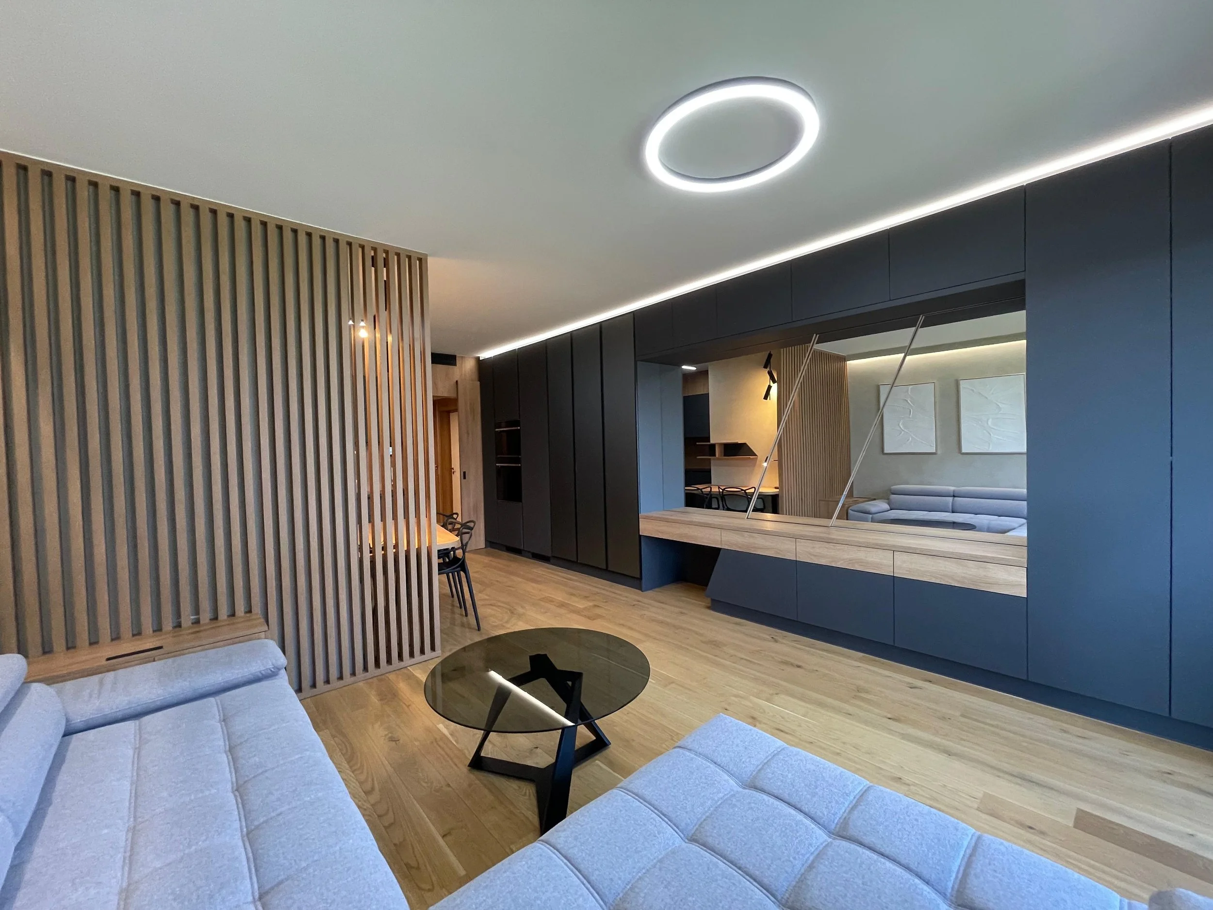 Interiér propojuje čisté linie, tmavé matné plochy a přírodní dekor dřeva do harmonického celku, který působí klidně, nadčasově a velmi útulně. Dominantou návrhu je nábytek na míru, promyšlené členění prostoru a práce se světlem, která celému interiéru dodává hloubku i atmosféru.